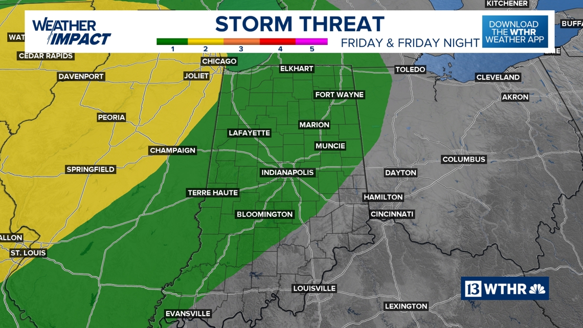 There is a low risk of severe storms Friday, but the main lifting mechanism appears displaced west of Indiana. Most areas should see only isolated showers or storms. Still, any storm that does form could strengthen — we’ll monitor closely.