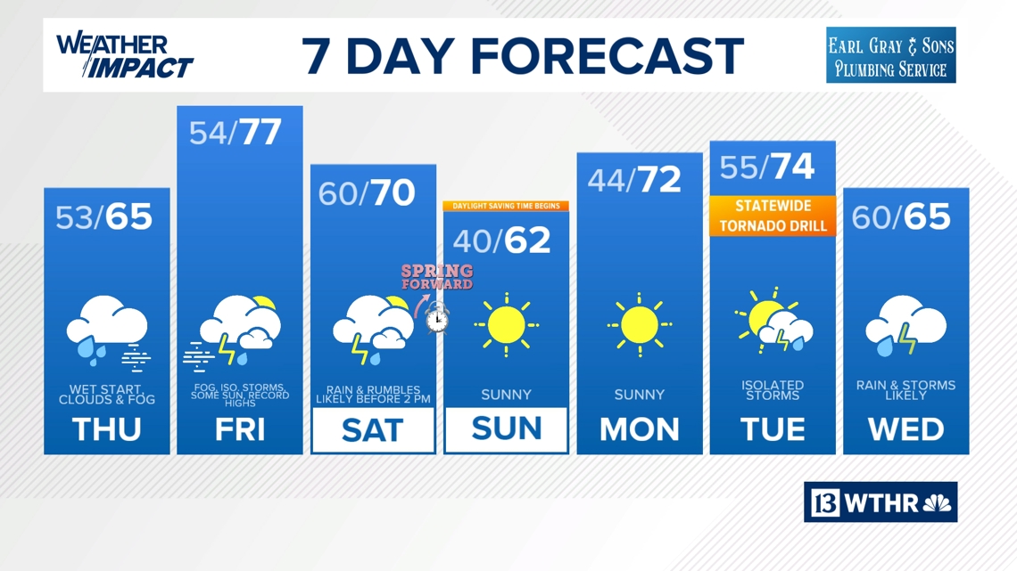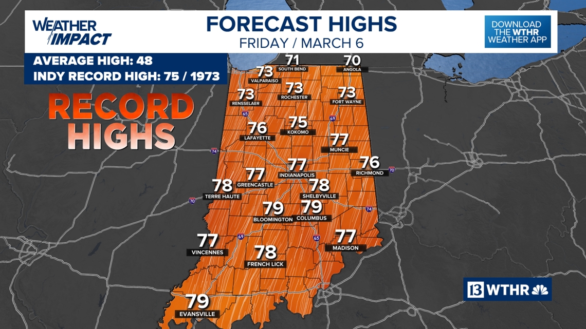 The forecast high in Indianapolis on Friday is 75° to near 80°.