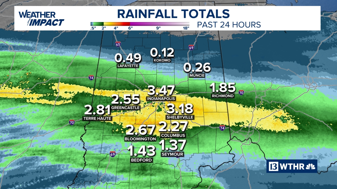 A wide swath of 2 to 4 inches of rain fell along and just south of the I-70 corridor, where areas of flooding continue at this hour. Ponding on roads, swollen creeks and standing water in low-lying areas remain concerns.